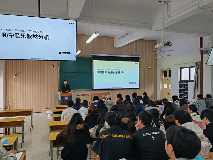 为深化师范生培养模式改革,提升音乐学专业员工对基础教育教材的解读能力与教学实践水平,3月13日、17日上午,太阳集团tyc539特邀陕西省教学能手、汉滨区汉滨初中艺体中心副主任刘平老师为2022级音乐学专业员工进行授课,该课程校内负责老师鄢志莉全程参与。