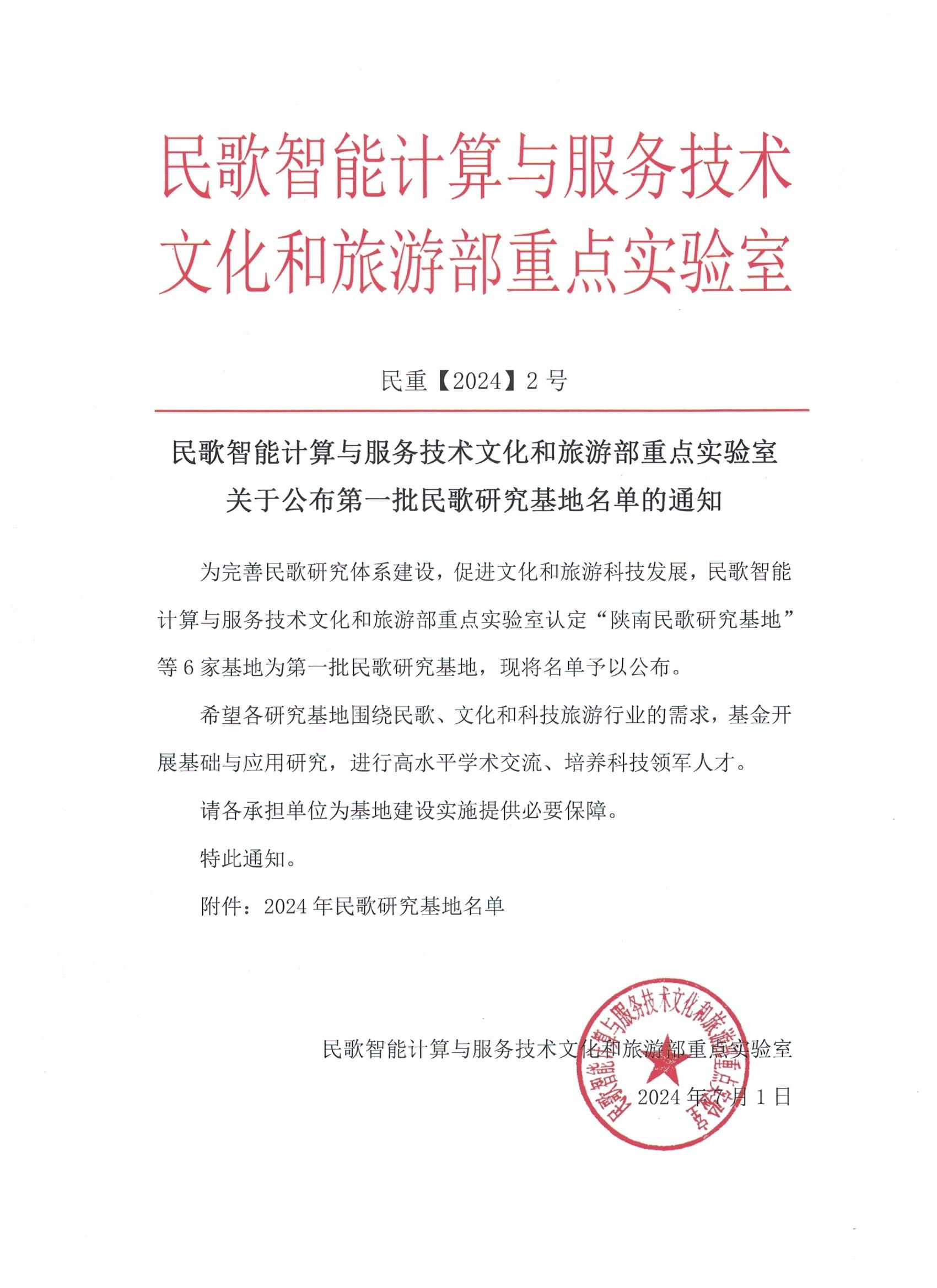 7月15日,文化和旅游部“民歌智能计算与服务技术重点实验室”研究基地建设研讨会在内蒙古师范大学举行,公司获批“陕南民歌研究基地”,太阳集团tyc539获批实验室开放课题两项。