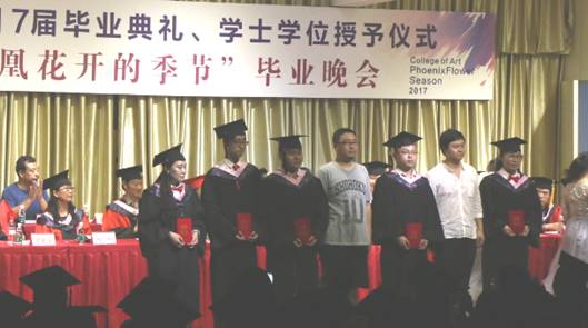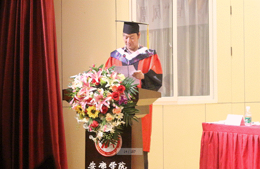 美术系教师老教师周平老师全体教师在毕业典礼上发言,发言中,他深情的回顾了与同学们相处的点点滴滴,祝愿同学们今后都要坚持自己的梦想,坚持学习,坚持从实际出发。他告诉大家:今天的典礼不是道别,而是猛士出征前的誓师;不管你们使用哪般兵器,选择哪条道路,时空变迁,总会在未来的某一个节点再聚安大,母校永远欢迎大家常回家看看。
