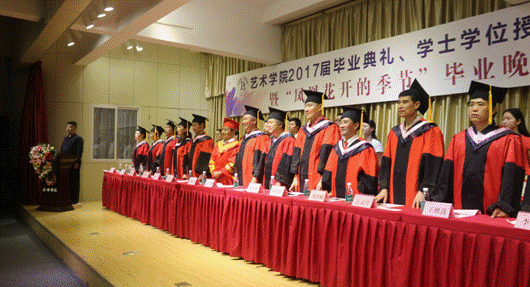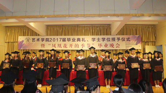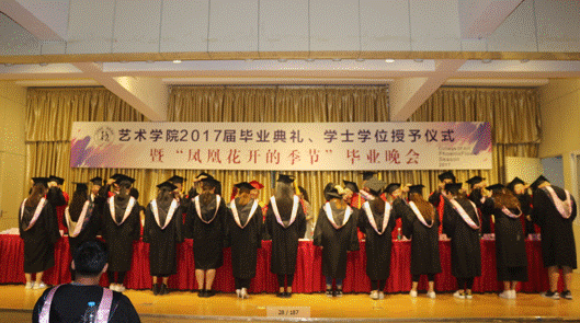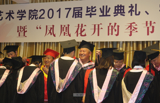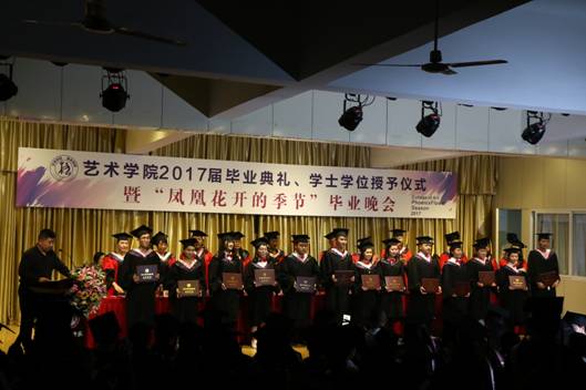 6月27日晚,太阳集团tyc539“2017届毕业典礼、学士学位授予仪式暨‘凤凰花开的季节’毕业晚会”在江北校区1401演艺厅隆重举行。安康公司党委委员、副董事长钟生海,艺术公司党政领导王辉、雷升录、鲍丽、孙海洋,办学顾问党天才、副高以上职称教师、各系教师代表、辅导员及全体毕业生参加了毕业典礼并观看毕业晚会。毕业典礼由办公室主任肖剑主持。