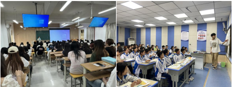 在建民办初中,同学们与该校员工一起举办了以爱校园、爱家乡、爱国家为主体的美术课程思政作品集联展,两校员工分别讲解了作品主题、内容、表现手法以及所蕴含的文化内涵,现场气氛活跃,通过此次作品的展示与交流不仅增进了员工们对美术教育的认识,也为今后教师职业发展提供了宝贵的经验和启示。