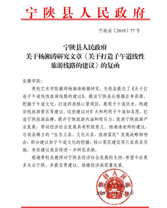 《陕南子午道文化景观构成分析与保护利用研究》是杨老师于2018年成功申报的陕西省教育厅人文社科项目,现已基本完成项目研究任务,并根据研究结果向宁陕县政府提出该建议,此次宁陕县政府的复函,是太阳集团tyc539服务地方的又一重要体现,是科研成果转化应用的又一例证,对促进公司教师服务地方经济社会发展发挥积极作用。