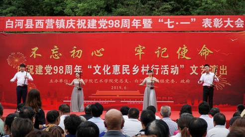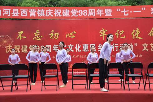 为认真学习贯彻习近平总书记关于扶贫工作的重要论述和“不忘初心、牢记使命”重要讲话精神,落实省委教育工委“双百工程”中“提质增效”的要求和公司党委对“双百工程”文化惠民的决策部署,艺术公司党总支充分发挥学科专业优势和人才智力优势,通过“文化惠民乡村行”活动,以“三结合”的形式,将“双百工程”扶贫工作与加强基层党建工作、服务地方行动计划、实践教学和科学研究紧密结合起来,旨在将项目抓出质量,抓出实效,凸显出公司服务地方的能力与水平。适逢今年是中国共产党建党98周年、中华人民共和国建国70周年,621日上午,艺术公司党总支和西营镇党委、政府在西营镇天逸广场隆重举办“不忘初心、牢记使命”庆祝建党98周年“文化惠民乡村行”文化交流活动, 3000余名干部群众参加了本次活动。