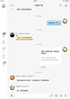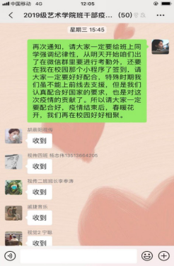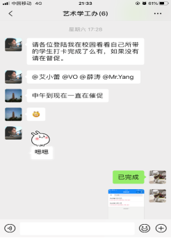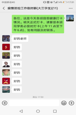 1.做好疫情期间的统计者。在疫情防控期间,各辅导员立即通过QQ、电话、微信等各类方式开展宣传教育、统计工作。公司疫情防控系统“我在校园---健康打卡”上线后,为确保公司员工打卡数据的准确和及时,辅导员们投身于每日疫情信息填报的工作当中,担当每日打卡的统计者和把关人。辅导员杨厚东利用“我在校园”平台发布“健康打卡通报”信息,悉心指导、认真总结每日打卡情况,做到问题早发现早解决。每天在截止时间即将到来的半小时内,总能看到辅导员在各自班级群中在@大家,坚持做到一个不少、一个不漏,准确上报全院员工信息。