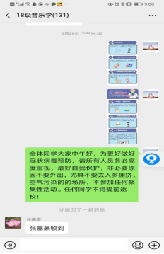 在公司疫情防控工作领导小组的安排部署下,公司辅导员们积极响应,落实行动。1月26日,学工办主任鲁澧要求各辅导员建立“年级---班级---宿舍”三级疫情防控联排机制,密切联系员工,掌握员工动态,做好员工健康状况的精准摸排,通过微信群、QQ群等平台和渠道,及时向员工传达疫情信息,普及科学防疫知识,引导教育员工积极应对疫情,坚决做到不传谣、不信谣,严肃纪律,落实员工“未经批准不得提前返校”要求,把员工们的生命安全和身体健康放到第一位。