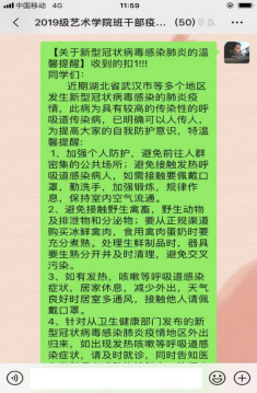 2.做好疫情期间的指导者。延迟开学期间,各辅导员通过转发相关文件,推送疫情防控老员工志愿者的先进事迹,教育引导班级员工要承担历史使命,履行社会责任,积极行动,共克时艰。引导员工做好防控措施,尽量居家减少外出,保持乐观的心态面对肺炎疫情。辅导员手机24小时开机待命,有问题的员工随时可以找辅导员进行倾诉,做员工心理疏导的知心人。对于员工的课程教学需求,公司采取“网上直播”的方式开展教学活动,辅导员积极配合员工网络学习工作,指导员工做好线上学习准备工作,及时通知课程信息。学工办主任鲁澧转发一流高校免费公开课程信息,引导员工利用假期时间,摆脱懒散状态,用学习充实居家生活。针对毕业班员工所面临的毕业论文、就业等问题,辅导员艾蕾积极联系员工和导师通过网络和电话等方式进行指导,搜集招聘信息、发布网络招聘时间安排表至班级群中,使毕业班员工做到招聘信息早知晓早行动。