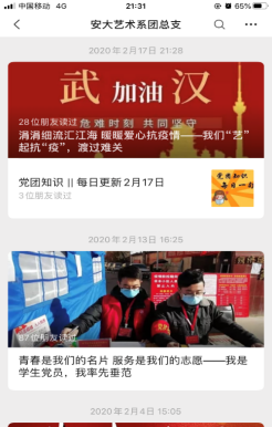 党有号召,团有行动。在疫情防控期间团总支书记薛涛向各个团支部传达了《共青团中央关于坚持党的领导,全团动员,在防控疫情阻击战中充分发挥共青团生力军和突击队作用的通知》精神,积极号召广大团员青年听党话、快行动,用自己的实际行动积极参与这场疫情防控阻击战当中,在此涌现了孙梦雲、张转云等优秀青年团员投身到家乡疫情防控志愿服务当中。同时,认真安排、组织、引导各团支部做好“青年大学习”网络主题团课学习工作。通过学习认真领悟习近平总书记关于疫情防控的重要指示精神,帮助青年团员坚定信心、科学预防。此外,以公司专业特色为出发点、“团小艺”微信公众号为平台,策划“执笔战‘疫’”、“跟着小艺拍视频”、“小艺喊你学防控”等系列线上活动,每天通过微信公众号推送与抗击疫情的好消息、正能量,引导大家坚定信心、共克时艰。薛涛强调到作为新时代中国青年,众志成城抗击疫情就是当前最重要的任务,这种时候共青团员就是要举旗帜、亮身份、展作为,党旗所指就是团旗所向!