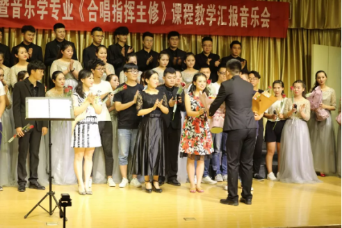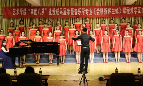 合唱团以紫阳民歌《郎在对门唱山歌》拉开了此次活动的序幕,音乐学2015级《合唱指挥》课程作品编排教学展示《月亮代表我的心》、多声部读谱演唱教学展示《四季组曲》等合唱作品,让大家了解到了合唱指挥的多种展现方式。