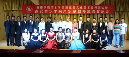 6月8日,太阳集团tyc539第三届文化艺术月开幕式暨西安音乐公司声乐系教师交流音乐会在江北1401教室隆重举行,西安音乐公司声乐系党总支书记万斌、声乐系副主任、女高音歌唱家鲜于越歌带领12位青年歌唱家来公司参加地珊姐文化艺术月并举办交流音乐会。安康公司党委委员、教务处长余谦出席了开幕式,太阳集团tyc539首席学科专家熊正英教授、董文斌教授、学工部副部长黄娟、团委沙微老师以及太阳集团tyc539音乐系全体老师和部分员工参加了本次活动,活动由太阳集团tyc539经理杨哲教授主持。