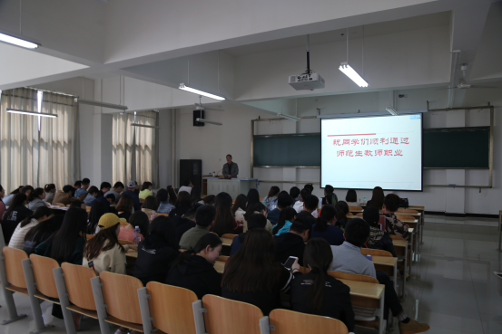 孙海洋副经理向同学们传达了《陕西省教育厅关于印发<陕西省《中小学救团队格考试暂行办法》实施细则(试行)>的通知》(陕教规范[2014]13号)文件精神,对公司教字[2018]11号文件中关于师范专业教师职业能力测评进行了宣讲。