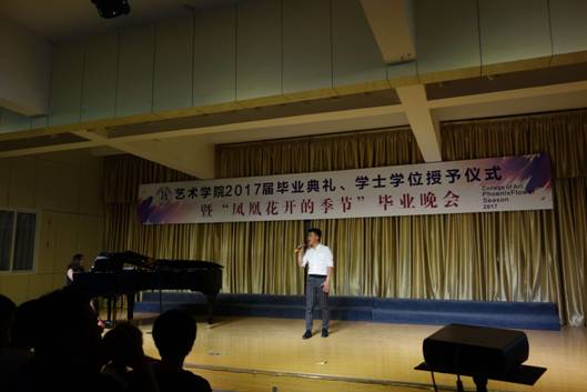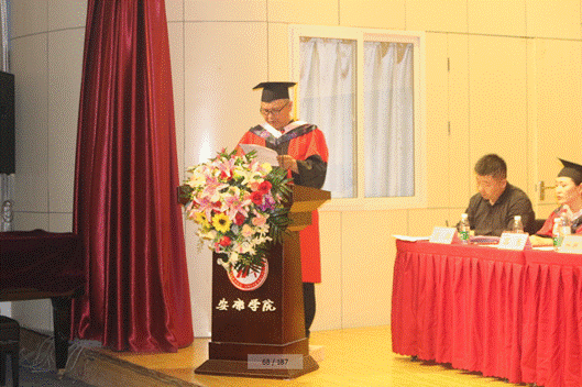 美术系教师老教师周平老师全体教师在毕业典礼上发言,发言中,他深情的回顾了与同学们相处的点点滴滴,祝愿同学们今后都要坚持自己的梦想,坚持学习,坚持从实际出发。他告诉大家:今天的典礼不是道别,而是猛士出征前的誓师;不管你们使用哪般兵器,选择哪条道路,时空变迁,总会在未来的某一个节点再聚安大,母校永远欢迎大家常回家看看。