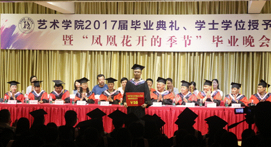六月注定是一个分别的季节,无论毕业大戏多么的华丽,绚烂过后,他们即将与我们挥手告别。晚会邀请了员工周翰祥为大家演唱了歌曲《凤凰花开的路口》,同学们随着歌声,用复杂的心情告别熟悉的校园,告别昔日的同窗,告别了一段纯真的青春,一段年少轻狂的岁月,一个充满幻想的时代……所有的话语都化作歌声传达出来,在难舍难分的气氛中,教师代表冯宏钊等十几名同志现场为毕业生赠送了小礼品——毕业寄语卡片。