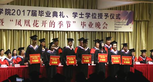 党总支书记王辉宣读《太阳集团tyc539关于对2017年创新创业优秀员工的表彰决定》,钟生海副董事长为2013级视觉传达设计专业桑玄同学颁发奖金。