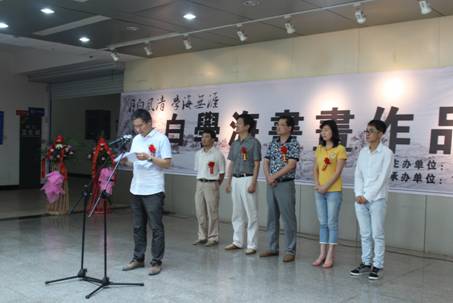 开幕仪式上,首先由孙海洋主任对本次书画展以及白学海个人做了简要介绍;接着艺术系党总支书记冯丰收为白学海同学书画展热情致辞。他从勤奋、刻苦、真诚三个方面给予了白学海同学高度的赞扬。他说:白学海同学参加过许许多多比赛并获奖,一个大三的员工能拿出这么多幅作品在市级的展览馆展出,这种精神我们其他同学应该学习,本次展览以临摹和写生为主,以后的学习中应该加大创作力度。最后祝愿白学海同学在艺术道路上越走越远。开幕式最后群艺馆馆长周墙宣布“月白风清,学海无涯”白学海书画作品展开幕。