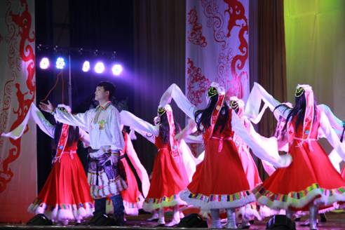 开场时活力四射的爵士舞霎那间点燃全场观众的热情,“蓓蕾”瞬间绽放,艺术风采从此展现!UN乐队充满激情演唱的《我们的新时代》,引起了全场“90后”老员工的共鸣,大家不禁跟着乐队挥手唱起来。陕西电视台“都市碎戏”栏目组特邀剧社——艺术系蜗牛话剧社表演的《大宝天天见》,以幽默诙谐的语言,憨态可掬的肢体表达,使得全场观众忍俊不禁,掌声连连。正值迎马年之际,我系外聘教师翟新华老师带领员工为大家演奏了二胡曲《赛马》,激扬的乐声、奋起的马蹄声,现场观众仿佛驰骋于广阔的草原之中,在新的一年我们要“一马当先”。晚上九点五十分,艺术系2014年“艺马当先”元旦晚会在音乐学专业藏族员工班扎西演唱的《高原红》中圆满结束,藏舞的舞者为嘉宾献上了圣洁的哈达,表达了我们的新年祝福!