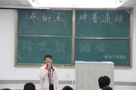 4月15日晚,我系“讲普通话诗文朗诵会”在江北校区2102教室举行。系党总支书记冯丰收、系学工办主任刘泽桢、系员工会干部、2012级员工代表及艺术教育班全体同学参加了诗文朗诵会。