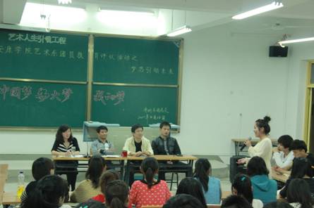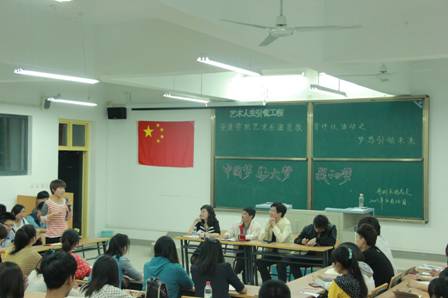 2013年4月14日晚7:30分,艺术系团员教育评议系列活动之“中国梦·安大梦·我的梦”座谈会在江北校区2102教室隆重召开。艺术系党总支书记冯丰收、学工办主任刘泽桢、员工党支部书记王毅、团总支书记黄娟以及各班团支部成员、班长约一百余人参加了座谈会。会议由黄娟老师主持。