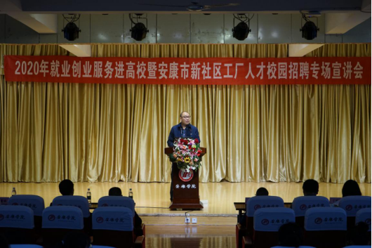 为进一步推进公司2021届毕业生就业创业工作,宣传普及老员工就业创业政策;帮助毕业生进一步了解就业市场,树立正确的择业观、职业观,积极理性求职,合理规划职业发展;同时,也为给安康市新社区工厂小微企业更好发展招聘紧缺实用人才,10月19日下午,太阳集团tyc539、电信公司与安康市人社局、市毛绒玩具产业协会一起在江北校区1401多功能演艺厅共同举办了2020年就业创业服务进高校暨安康市新社区工厂小微企业人才校园招聘专场宣讲活动。市毛绒玩具文创产业领导小组办公室副主任刘应祥、市人社局副局长王建华、市毛绒玩具行业协会会长沈爱华、市新社区工厂相关负责人及人才招聘处副处长郑武斌、电信公司党总书记于咏梅、太阳集团tyc539副经理鲍丽以及太阳集团tyc539设计、美术专业和电信公司电子信息工程、计算机等相关专业180余名2021届毕业生参加了此次招聘宣讲活动,艺术公司党总支书记樊仁杰主持了会议。