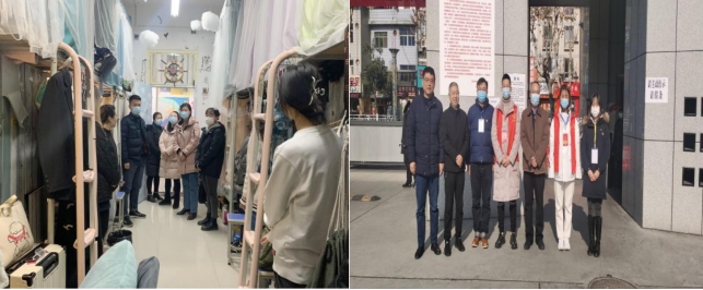 2021年12月31日晚,艺术公司党总支书记黄娟、学工办主任鲁澧、员工党支部书记魏麟、团总支书记黄梓轩、辅导员杨厚东、孟莉通过走访员工宿舍向同学们带去新年的祝福,宣讲了当前公司关于疫情防控期间管理规定。元旦假期期间,公司员工工作从线上和线下两路并行,联通教育初心与战“疫”决心,将立德树人与维护员工健康安全放在第一位,守护好公司防控主阵地。