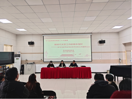 会议伊始,党总支书记黄娟作了题为《新时代文艺工作的根本指针——学习习近平总书记关于文艺工作重要论述》学习宣传党的二十大精神专题党课。党课指出,习近平总书记所作的党的二十大报告,站在全面建设社会主义现代化国家、全面推进中华民族伟大复兴的战略高度,提出“推进文化自信自强,铸就社会主义文化新辉煌”的重大任务,为新时代新征程做好文艺工作指明了前进方向、提供了根本遵循。在本次专题学习中,黄娟重点讲解了习近平总书记关于文艺工作重要论述的两个核心思想。一是坚持与时代同步伐。习近平总书记强调,“新时代新征程是当代中国文艺的历史方位。广大文艺工作者要深刻把握民族复兴的时代主题,把人生追求、艺术生命同国家前途、民族命运、人民愿望紧密结合起来”。结合公司实际,黄娟要求新学期各教工党支部要充分发挥专业特色,有效开展学习宣传党的二十大精神特色教育活动。二是坚守艺术理想,追求德艺双馨。习近平总书记强调,“文艺承担着成风化人的职责。广大文艺工作者要发扬中国文艺追求向上向善的优良传统,心怀对艺术的敬畏之心和对专业的赤诚之心,下真功夫、练真本事、求真名声”。结合本学期的师德师风教育,黄娟要求党员教师要积极将“德艺双馨的人生之路、艺术之路” 作为毕生追求,为公司教师队伍建设发挥重要推动作用。