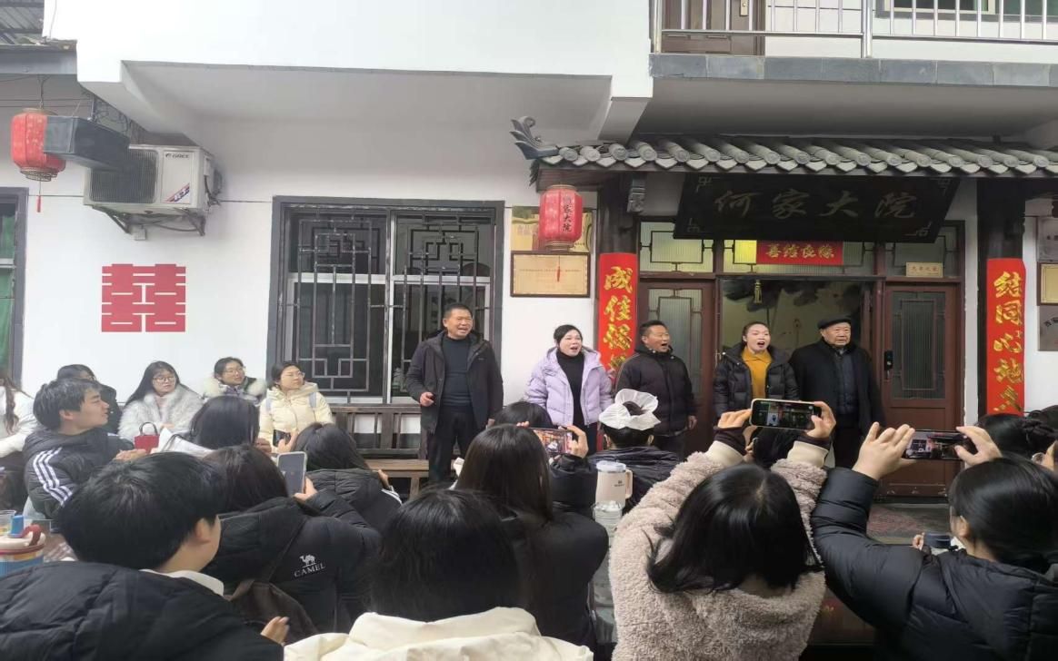 第二站大家来到紫阳民歌传承基地——何家大院,传承人何耀信、何显鹏带领紫阳民歌演唱团队热情地接待了公司师生一行。民歌演唱队演唱了多首地道的紫阳民歌,引得大家连连叫好。