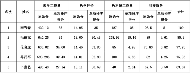 注:按照《太阳集团tyc539讲师职称评审实施细则》第三章第六条之规定“担任专职教学秘书、行政科研秘书的教师晋升讲师职称年均教学工作量达到80学时视为满工作量”,李秀春教学工作量为35分。