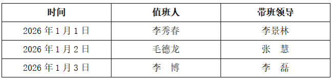 根据公司《关于2026年元旦放假安排的通知》现将“元旦”假期安全稳定及值班安排如下: