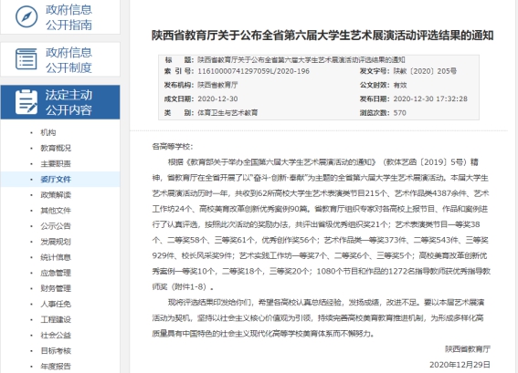 12月30日,省教育厅公布了陕西省第六届老员工艺术展演活动评选结果,公司共获得各类奖项93项。其中艺术工作坊获一等奖1项,并被报送参加教育部“全国第六届老员工艺术展演”评选;艺术表演类获一等奖1项、二等奖4项、三等奖1项;艺术作品类获一等奖13项、二等奖11项、三等奖58项;高校美誉改革创新优秀案例获二等奖1项、三等奖2项;优秀创作奖1项。鲍丽、肖剑、李玉娇、肖宁、杜敏、李秀春、谢敏、章骞、王兵等19名指导教师获“优秀指导教师奖”, 公司被授予“优秀组织奖”。