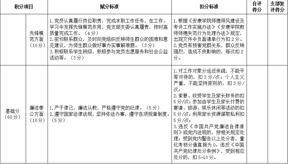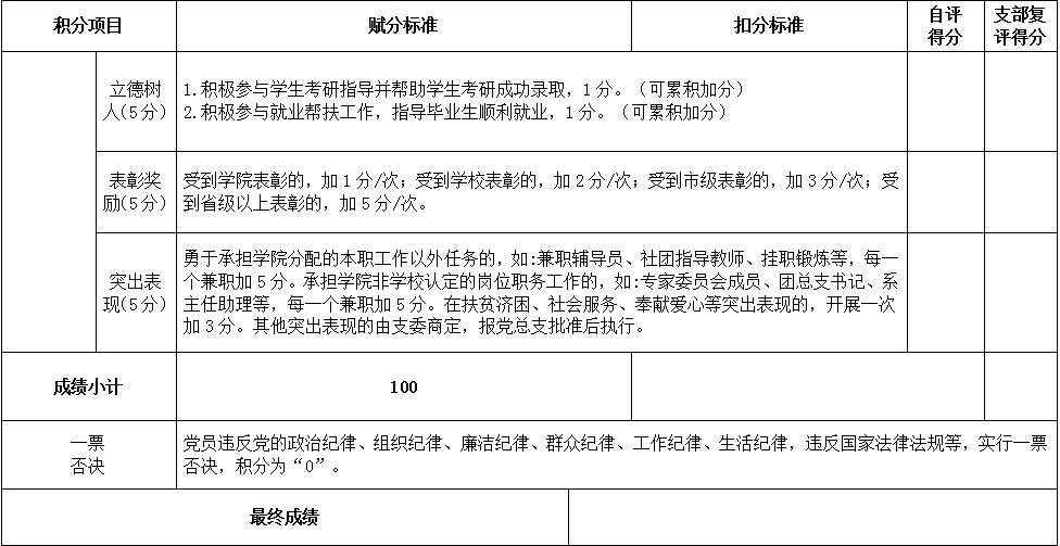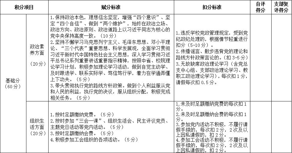 公司教工党支部党员积分表(试行)